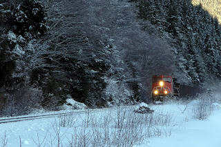 After being Passed by CN 2525 at the Skeena siding, I took off West after the unit towards the Kyex River bridge where this first photo was taken. The next three were photographed between the Kyex River and Tyee siding. The train had a single unit in the lead with another single unit at the end of the train. This is not the norm for coal trains in the area. They are usually pulled by 2 or 3 locomotives at the head end and a FRED unit on the tail end of the train. Has CN started running coal trains the same fashion as the CPR? We'll have to wait and see....
